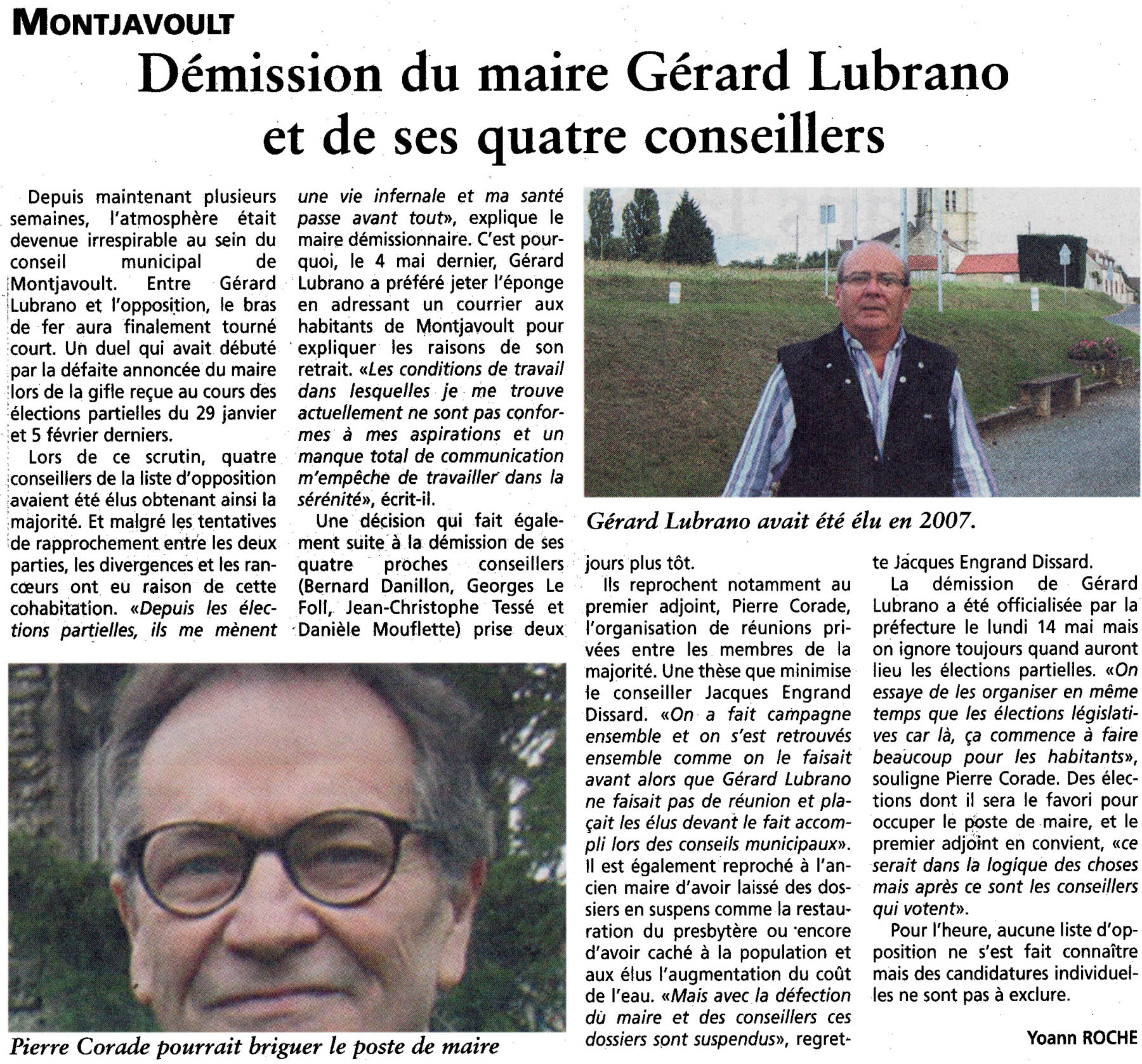 Un article est paru cette semaine dans l'Oise Hebdo n°951 du mercredi 23 mai 2012, sur la démission de Gérard Lubrano et les prochaines élections.