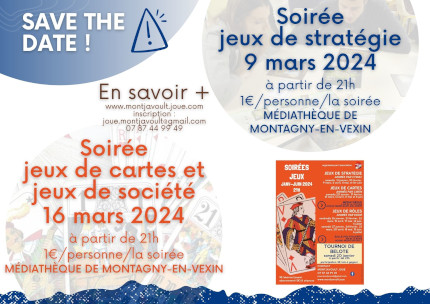 L'association Montjavoult Joue organise deux soirées jeux prochainement. La première ce samedi 9 mars, sur les jeux de stratégie, à partir de 21h dans la médiatèque de Montagny-en-Vexin. Puis la seconde sur les jeux de cartes et de société le samedi 16 mars, à partir de 21h dans la médiatèque de Montagny-en-Vexin.